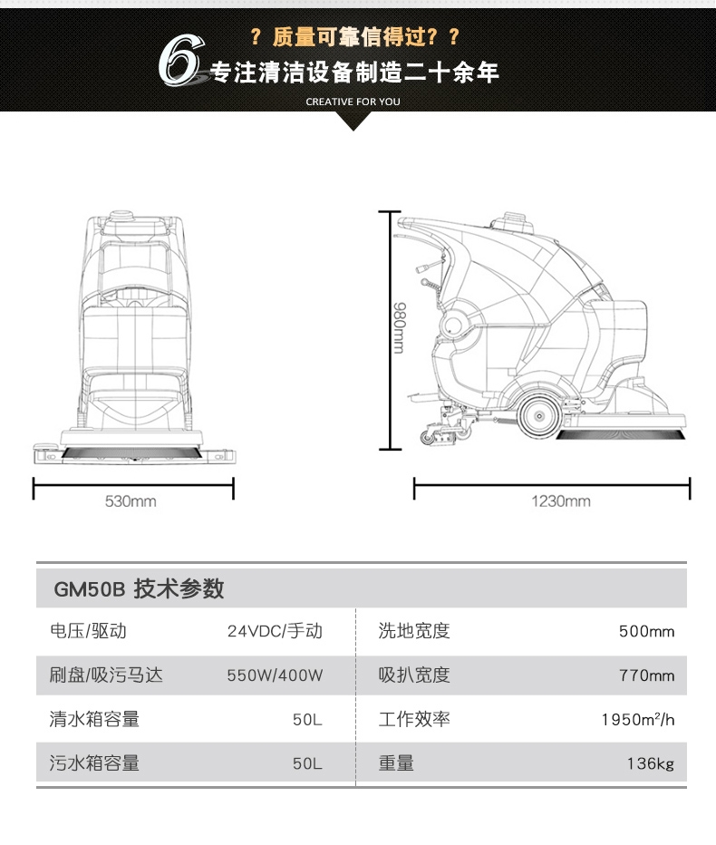 高美GM50B手推式電瓶洗地機,洗擦、吸干一次性完成,適用于500